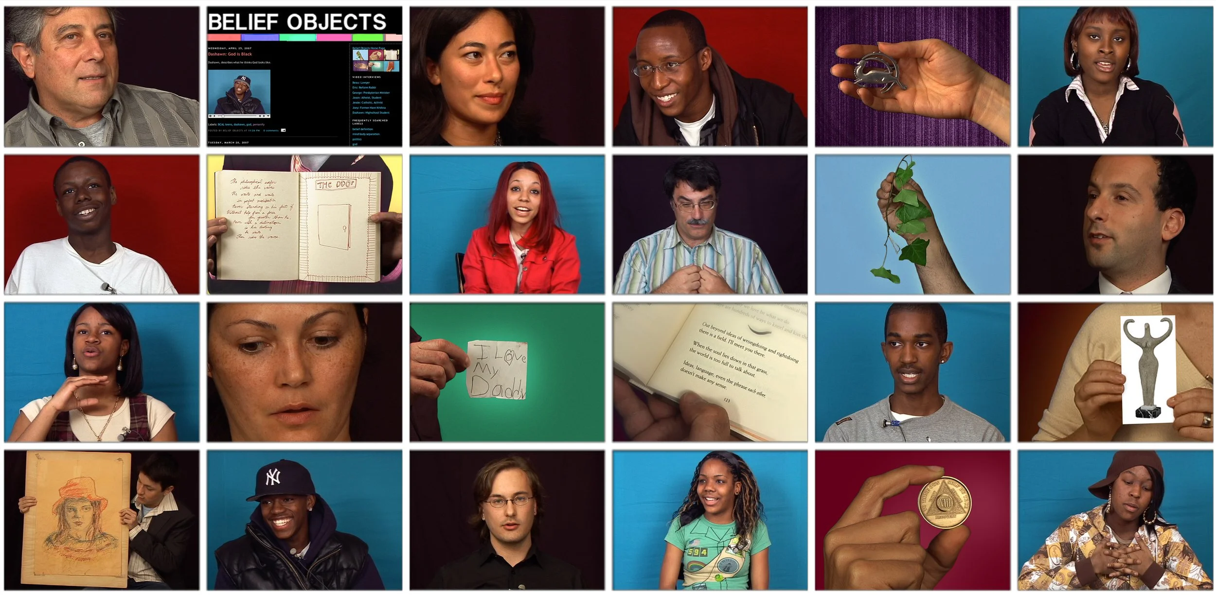 Belief Objects was a video interview project exploring how individuals define their belief systems. It emerged in post-9/11 New York City, shaped by the atmosphere after George Bush’s second election. During that time NYC was being used as a symbol to give the conservative government moral authority to influence the national election and justify war, while New Yorkers’ voices were largely absent from the conversation.